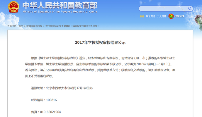 1月8日,国务院学位委员会办公室发布了《2017年学位授权审核结果公示》,对各省(区、市)推荐的新增博士硕士学位授予单位、博士硕士学位授权点、自主审核单位的审核结果予以了公示。