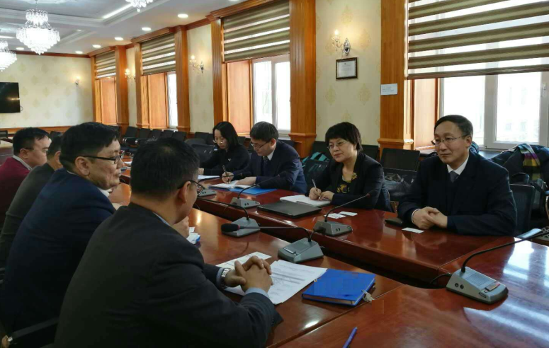 1月3日下午,代表团访问了蒙古科技大学国际交流和合作办公室。蒙古科技大学分管科研和对外合作的副校长Namnan肯定了两校交流合作成绩,并提出双方合作创办学术刊物等深化未来合作建议。